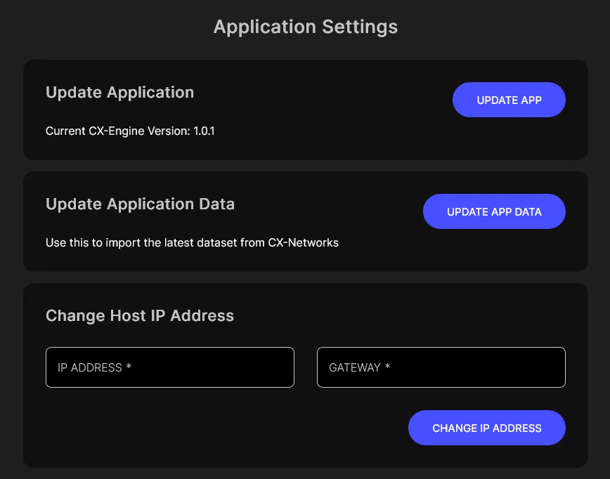 The CX-Engine receives regular updates in which software errors are fixed or functionalities are added. To do this, the CX-Engine must be connected to the Internet. So before you start an update, check whether the IP settings of the CX-Engine are correct! You can view updates in the app menu. There you will find two buttons:
